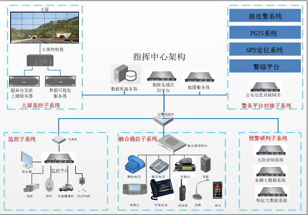 指揮中心解決方案圍繞指揮實(shí)戰(zhàn)應(yīng)用平臺(tái)這個(gè)核心,將業(yè)務(wù)流程中所需用到的報(bào)警監(jiān)控子系統(tǒng)、融合通信子系統(tǒng)、預(yù)警研判子系統(tǒng)接入,同時(shí)完成對(duì)外部警務(wù)平臺(tái)的對(duì)接和機(jī)房動(dòng)環(huán)監(jiān)控子系統(tǒng)的輔助支撐,然后由大屏顯控子系統(tǒng)的上墻展示。