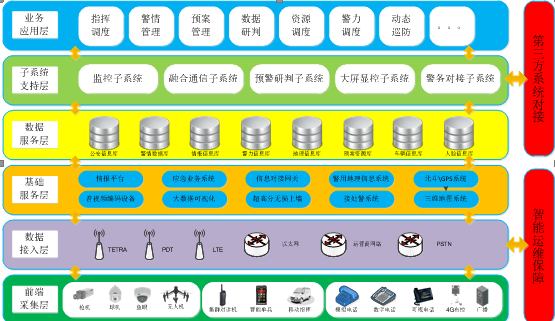 第六層為業(yè)務(wù)應(yīng)用層:應(yīng)用層主要是展現(xiàn)給客戶,客戶可以操作的一些應(yīng)用,包括,可視化警情管理、警情同步下發(fā)、空中出警、資源綜合展現(xiàn)、扁平化指揮調(diào)度、網(wǎng)格化巡防管理等應(yīng)用功能。